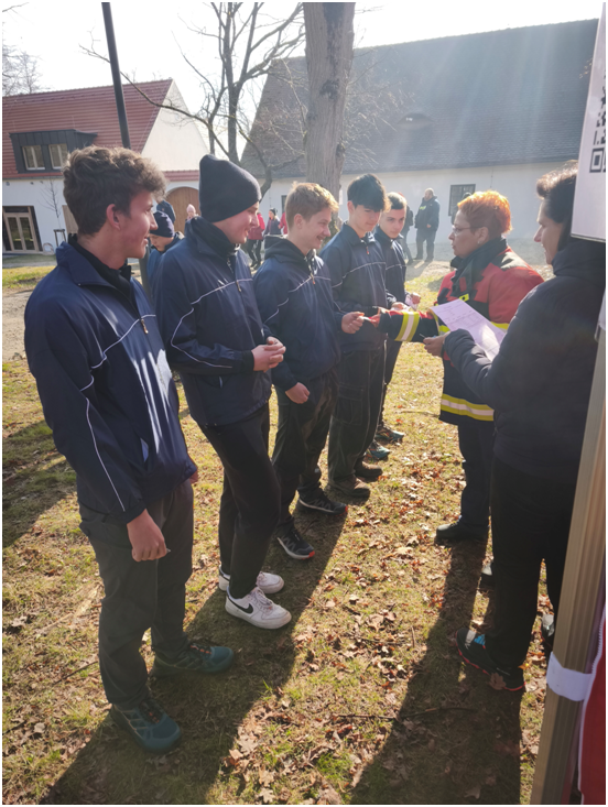 Vybíháme na louku a už slyšíme řev trenérů! Před námi je poslední stanoviště „ochrana obyvatelstva“, kde bleskurychle sestavujeme záchranářskou uličku, říkáme, na jakou tísňovou linku a jakým způsobem voláme při různých situacích a přiřazujeme kartičky s obrázky různých věcí podle toho, jestli ta daná věc patří do evakuačního zavazadla nebo ne. I my víme, že už musíme hrát o každou vteřinu a ze stanoviště už to máme jen kousek z kopce do cíle, a proto běžíme za mohutné podpory trenérů a fanoušků ze zbytku svých sil.