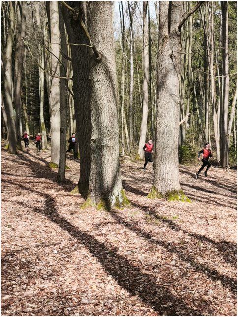 První bod pro měření azimutu je jen pár metrů od stanoviště zdravovědy a Radim již měří a určuje nám směr, kterým máme pokračovat. V rámci hledání azimutu opouštíme lesní cesty a pěšiny, po kterých se dosavadní část závodu ubírala a běháme ve volném lese. Při zaměřování azimutů zahlédneme před sebou kluky z Tlučné, ale zase je ztrácíme. Po zapsání všech tří bodů na krátkou chvíli zaváháme v dalším pokračování, ale daří se nám dostat opět na značenou trať, která zase vede po lesní cestě. Na většinu členů hlídky přichází první výraznější fyzická krize, ale náhle před sebou vidíme kluky z Tlučné a to v nás vyburcuje zbytky sil a jdeme před ně! Navíc víme, že už se musíme blížit do závěru závodu.